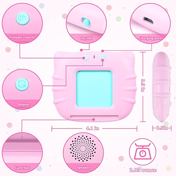 - [ Easy to Use ] - Put the card into the card reader’s slot, the card reader will pronounce the words in both English & Spanish. When an animal card or transport card is inserted the card reader will play real animal or transport’s sound. Press the repeat button to repeat the pronunciation and sound effect.