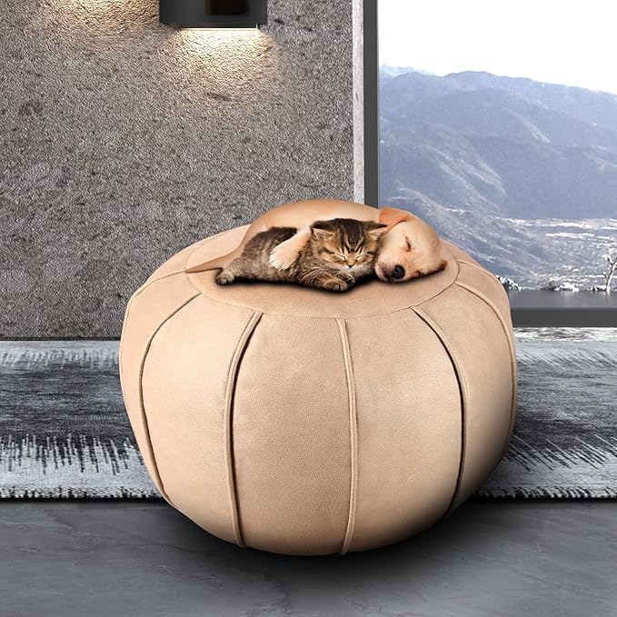 - COMFORT and COMPACT: Leather ottoman dimension is approximately 21” dia. and 13” high, weighing a mere 1.1 lbs. (unstuffed weight). Lightweight & portable design makes pouf fit in perfectly just about anywhere.