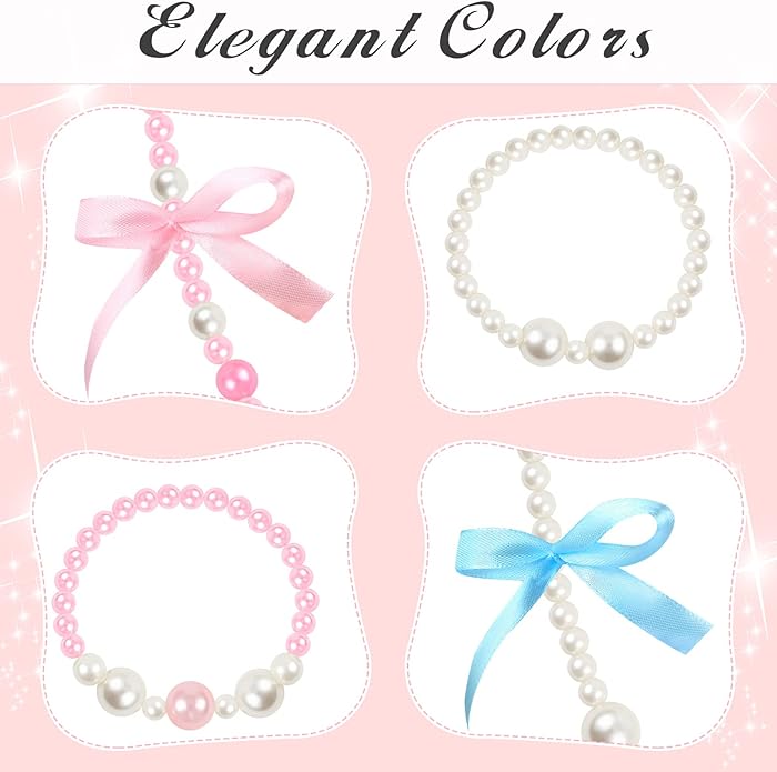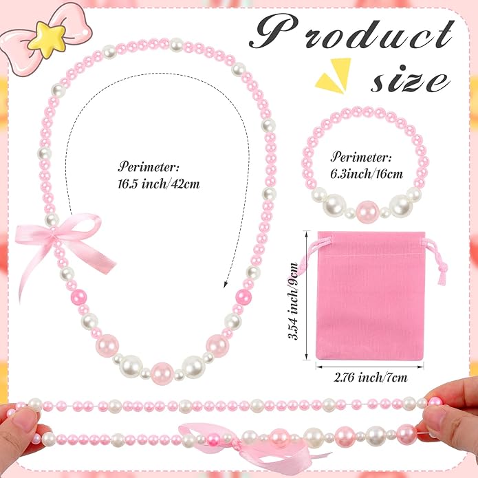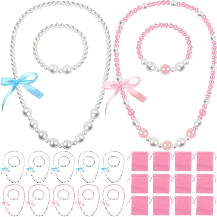- 12 Sets Princess Tea Party Favors: you will get 12 beaded bracelet pearl necklace sets, coming with 12 velvet pouches; The pearl necklace and bracelet are with 2 colors, pink and white, presenting elegant and pretty