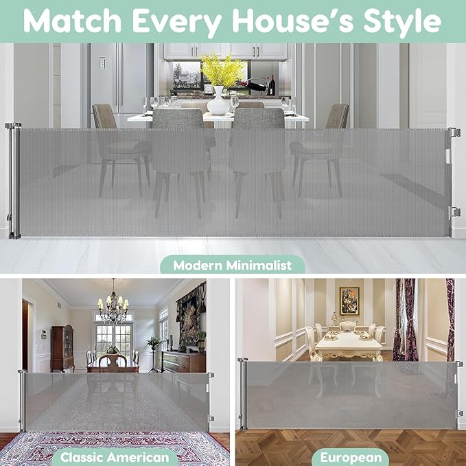 - Retractable Gate: The extra wide dog gate for the house can be retracted, so you can roll up the mesh when you don't need to use it and save your space. Easy for your friends to pass through the outdoor baby gate when you have a party or friends visiting your home.