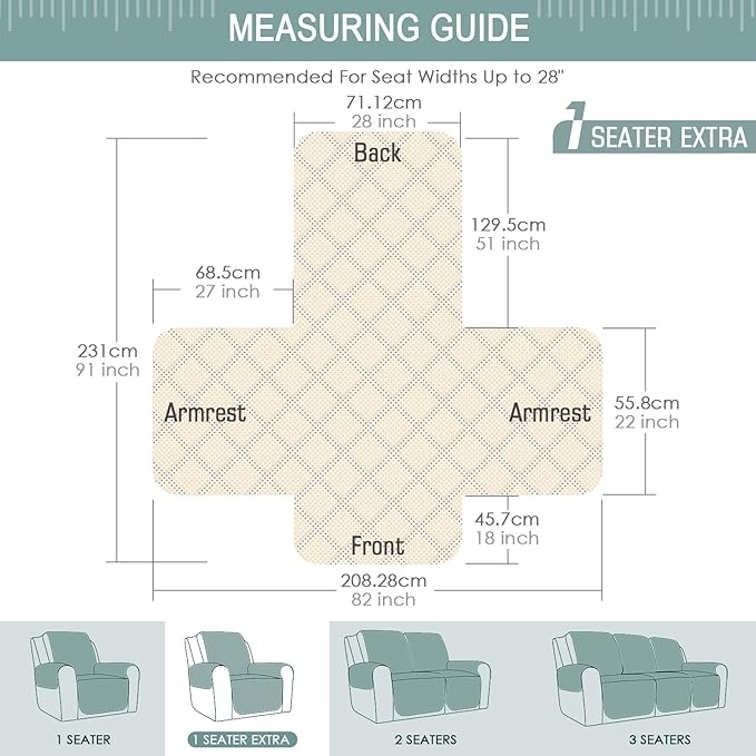 - 【DIMENSIONS GUIDE】 There are two sizes of sofa slipcovers available that will fit most family furniture. Large pet recliner covers fit a chair with a seat width of 28 in, see measurement guide in photos. NOTE: Please confirm the size before purchasing