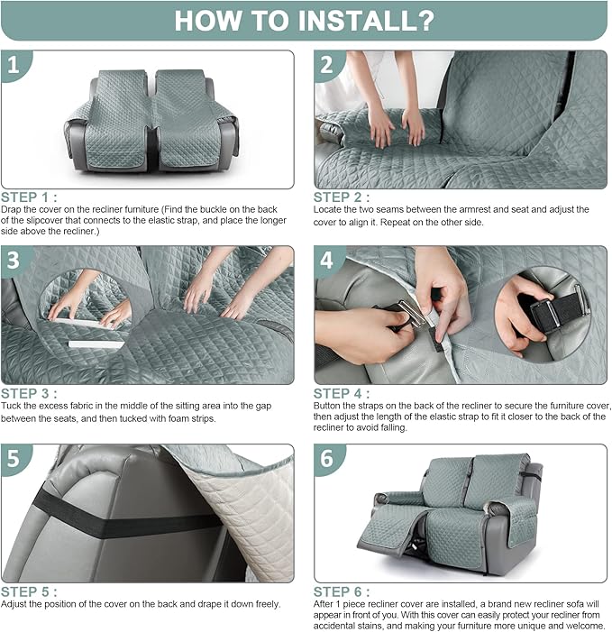 - 【REDUCE SLIP-OFF CONCEPT】 1.Solid round colloid design on the back of our recliner cover; 2.Additional flexible elastic straps and foam strips, 3.Two elastic straps on the bottom of the seat cover and matching buckles (only two)