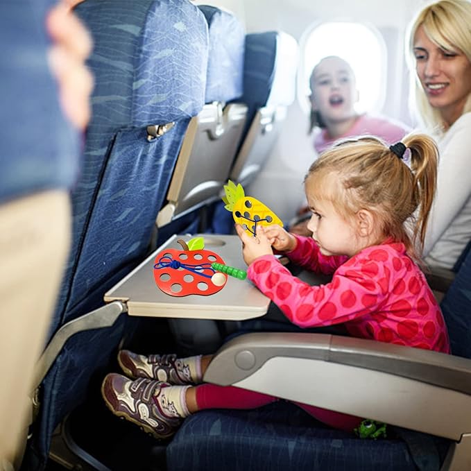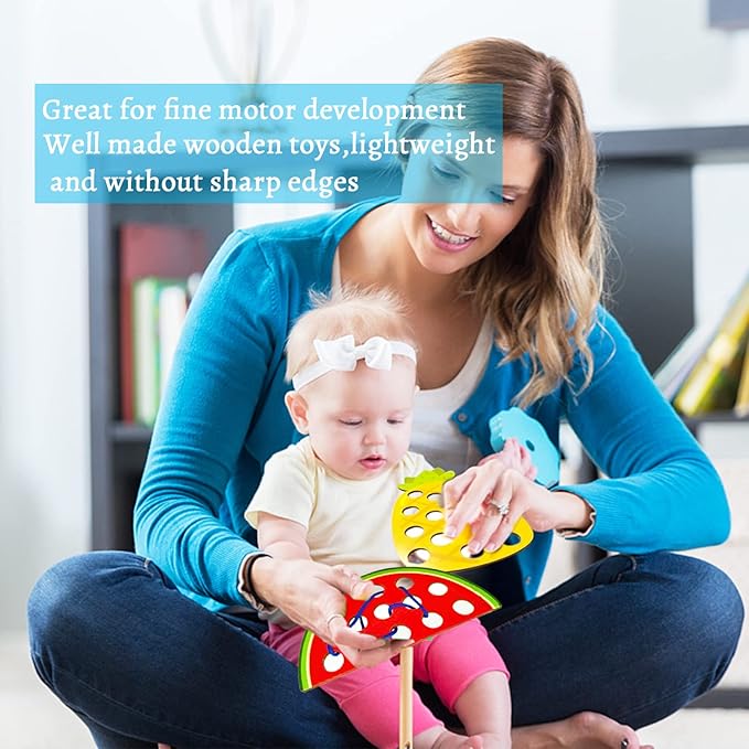 - ☺Lacing fruit toys for toddlers:4 pack fruit wooden lacing toys:watermelon,pear,pineapple,apple,each of them comes with a hungry caterpillar which is the sew tool for you to sew through the holes of the wooden.They are small and good for taking places where you need a quiet activity.