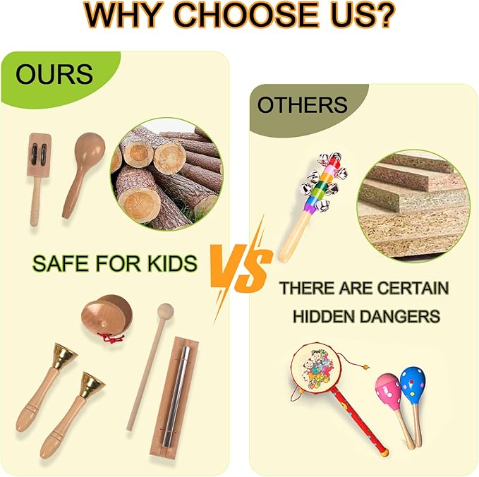 - 【Safe toys for Kids】:This natural wooden musical toy set, including shaking, tapping, beating and blowing instruments, doesn't have any harmful water paint or chemical smell.CPC and CE Certification,made by non-toxic material.