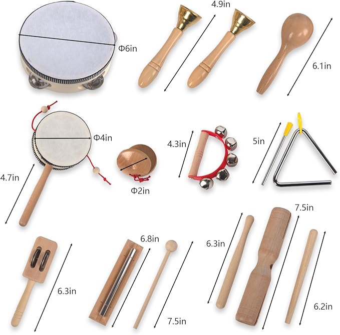 - 【What You Will Get】:You will get 16 pieces 10 kinds of wooden musical instruments in this set with a bag.