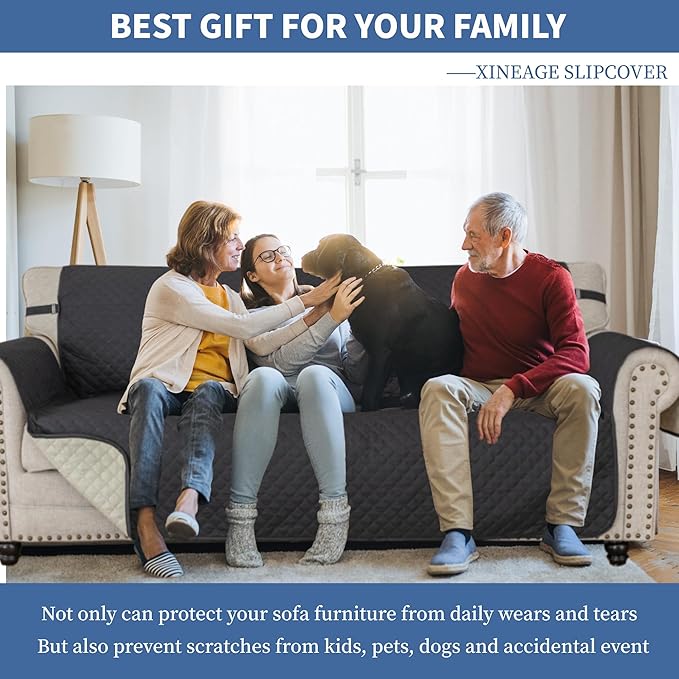 XINEAGE Quilted Sofa Cover Waterproof Couch Covers for 3 Cushion Couch, Super Soft Washable Slipcover with Pockets & Non-Slip Elastic Straps, Thick Furniture Protector (Sofa, Black)