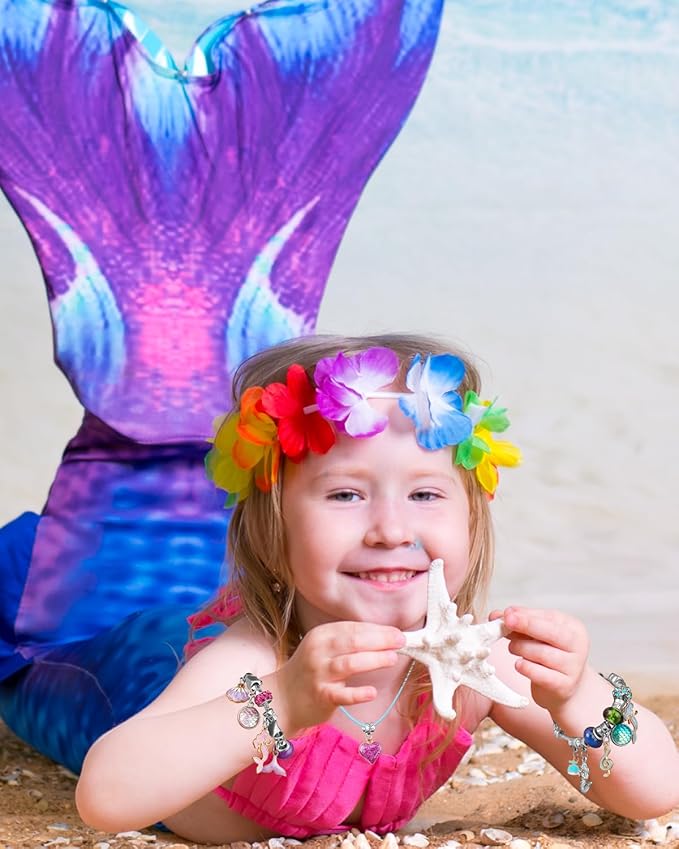 - Purple & Blue Mermaid Jewelry Set: 24 days of Christmas advent calendar. This charm bracelet making kit including 2 snake bracelets, blue mermaid, purple mermaid, starfish, shining fish scales, shark, etc. The mermaid bracelet set is a perfect toy for girls princess themed parties, Mermaid party supplies, little mermaid dressing games, fun play, realize the princess dreams of your girls.