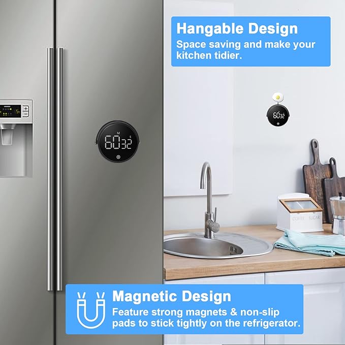 - Easy to Use: Upgraded version kitchen timers for cooking, rotate the knob to set time, kids and seniors can easily set it. If there is no operation within 5 seconds in the working state, the smart digital productivity timer will automatically reduce the brightness. Effectively and energy saving.