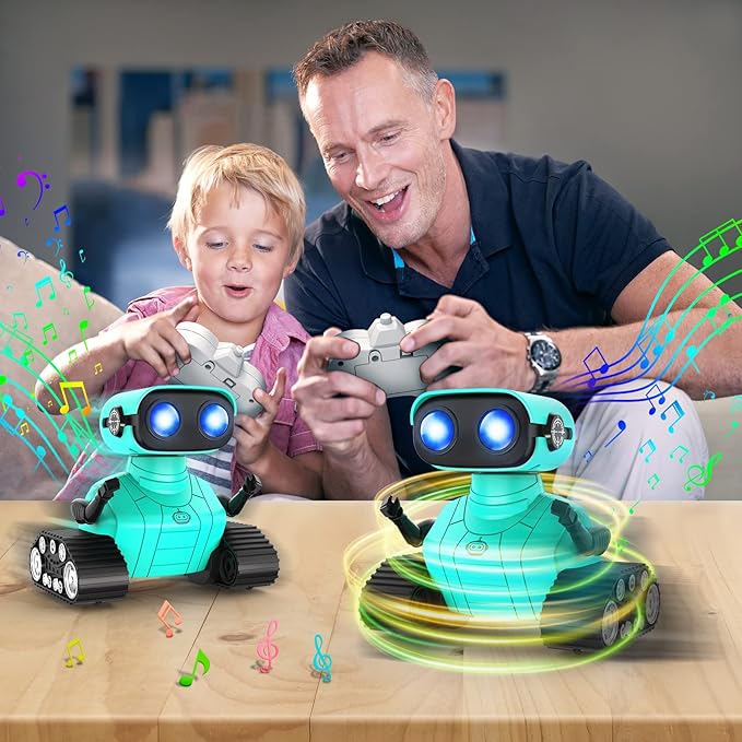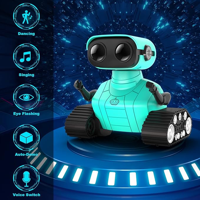 - Multifunctional Robot: LED eyes can light up once you turn on the robot, you can also make it blink or closed by the controller. Smart Voice - turn on the robot it will start talking, he can also sing different songs which can be switched by remote; the track of the tank allows the robot to move forward backward left, and right flexibly. Under demo mode, it will begin 360-degree spins, dancing with flexible arms and heads.