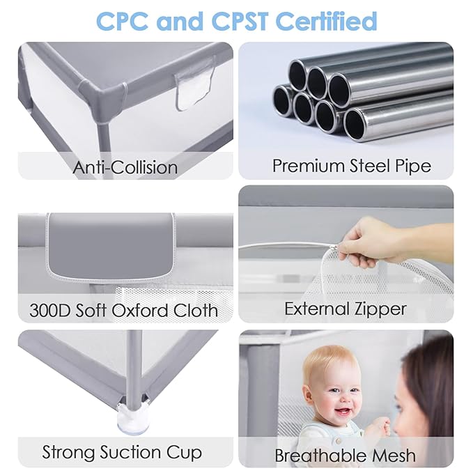 - āØ[Spacious Baby's Safe Playground]: Playard for babies and toddlers measures 79x59x26 inches, with enough room to hold a lot of toys, and adults. The corners and pipes are made of thickened sponge to protect the child's head from collisions, and the internal stainless steel pipe can withstand a pressure of 30 kg. There are 4 suction cup devices at the bottom with super suction Ensure that the fence will not tip over and move. Baby playpen large baby play yards indoor baby playpen for toddler