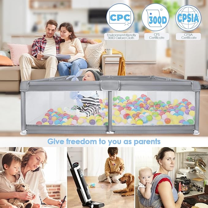 - āØ[ 360° Full Vision Playard with Gate]: We know our babies don't like being in an enclosed space alone, so our playpens are designed with a visible soft breathable mesh that lets us see our baby and baby sees us, keeping baby comfortable and safe. Both sides design with mesh doors with zippers for our baby allowing our baby to freely enter and exit the playpen. Baby large playpen large play yard indoor playpen baby playpen for babies and toddler