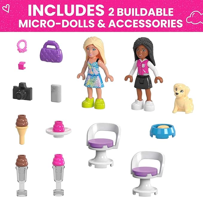 - 225 bricks include 2 buildable Barbie micro-dolls, 1 pet puppy, fashion and food accessories