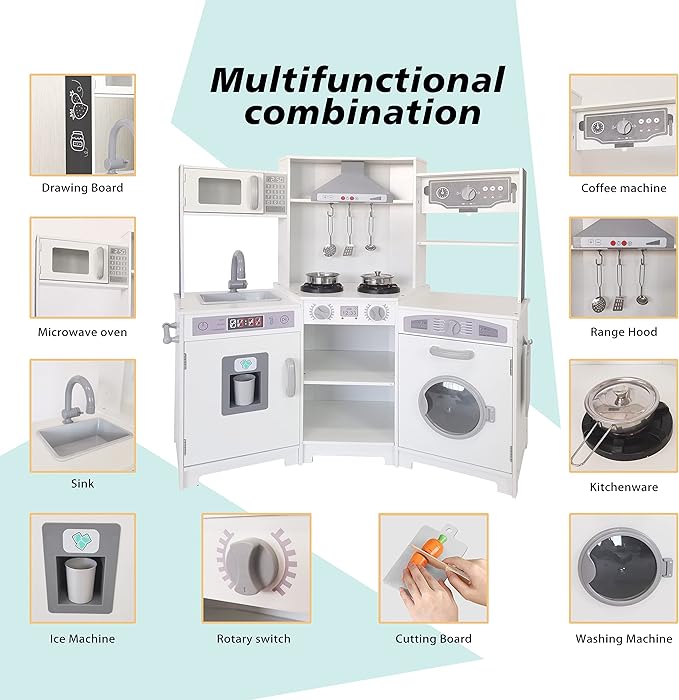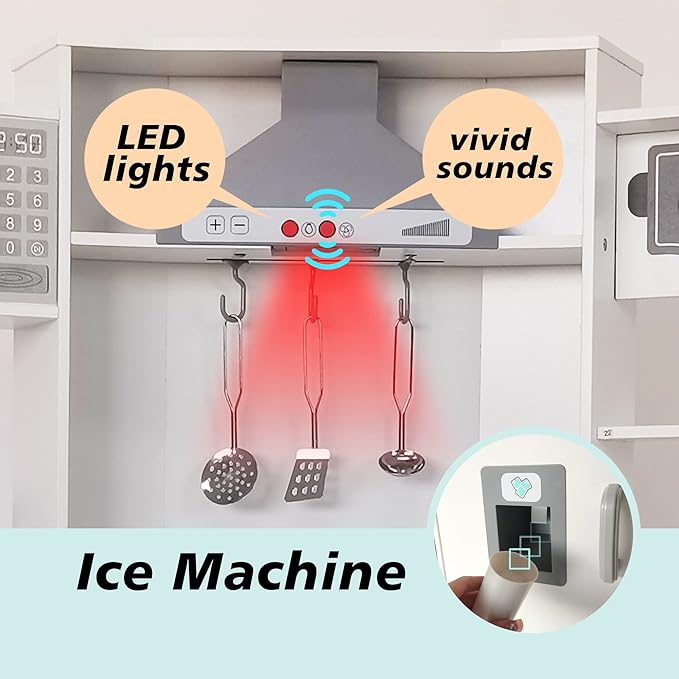 - Vivid and realistic kitchen:kids kitchen playset boasts an array of interactive features including an ice maker, washing machine, microwave, stove, faucet, sink, clock, kitchen ventilator, oven, and cupboards.kids can freely pursue their interests and hobbies. Simulate various life scenarios. This rich configuration stimulates children creativity and coordination as they explore various culinary scenarios.