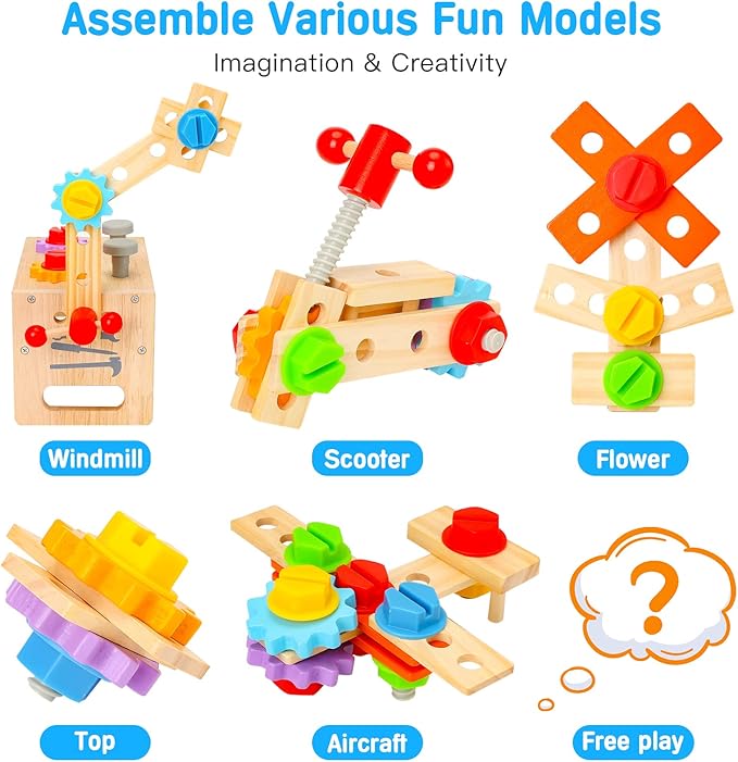 - 【STEM Montessori Toys for 3 Year Old】Our kids tool set is easy to assemble and disassemble. Kids can learn to twist screws with screwdriver, hit nails with hammer, use spanner, saw the wood, and play the gears. Through playing the wooden toys, kids could enhance their fine motor skills, hand-eye coordination and problem-solving skills. Great Montessori toys for 2 year old and fun stem toys for 3 year old boys girls.