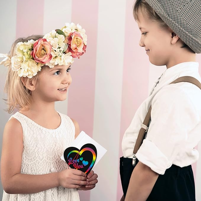 - SCRATCH YOUR HEART OUT: Valentine’s Day cards for kids with a mesmerizing rainbow twist! This pack comes with a set of 48 scratch-off hearts, 48 scratching sticks, 48 red strings, and 48 white envelopes. Everything you need to inspire lovey-dovey creativity.