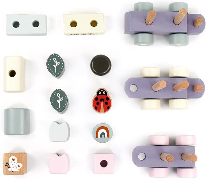- Kids Train Set: The train set includes 13 different colorful building block shapes that fit on the poles of 3 interlocking rolling train cars, allowing kids to build, stack and roll while developing their fine motor skills