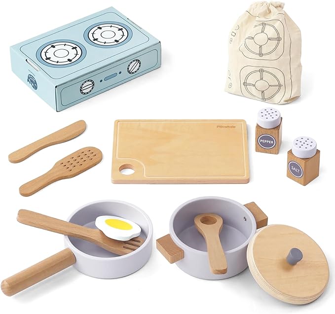 • Play Kitchen Pots and Pans: Stir up some fun with our wooden cookware toy set, igniting a world of playful kitchen adventures that will whisk young chefs away on a delightful journey