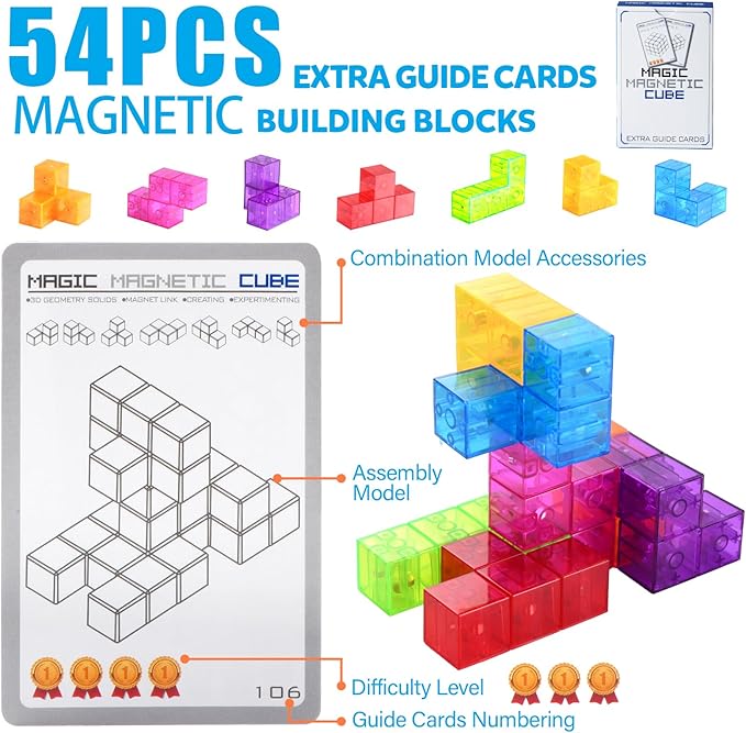 - 【Magnetic 3D Cube】: This children's educational toy includes: 7 magnetic 3D cubes and 54 guiding cards, which can be assembled into 108 puzzles of different shapes and colors. Magnetic building blocks have a firm adsorption and do not fall off easily, it allows children to develop perfectly their creativity and imagination.