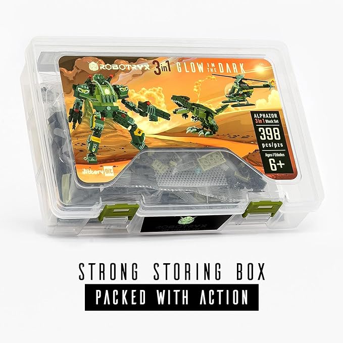 • 【Lots of Pieces for Hours of Fun!】This toy robot building construction kit with 398 interlocking brick and block pieces provides limitless fun. Kids can build three different figure forms including a Robot, a Raptor Dinosaur, and an Attack Chopper. Kids can be creative with buildable connector pieces to build robot characters. Glowing stickers let kids customize for DIY fun. They make their own stories with mech action figure and army action figures that are great presents for 8 year old boys.