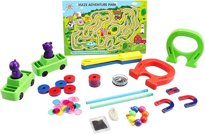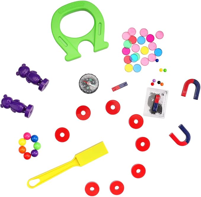 - Colorful Magnet Kit Includes - Magnetic cars*2; magnetic bears*2; ring magnets*8; magnet balls*7; bag of clips*1; compass*1; plastic horseshoe magnets*2; small metal horseshoe magnets*2; bar magnets*2; Iron power box*1; pencils*2; magnetic wands*2; maze board*1; metal balls*7; cotton string*1