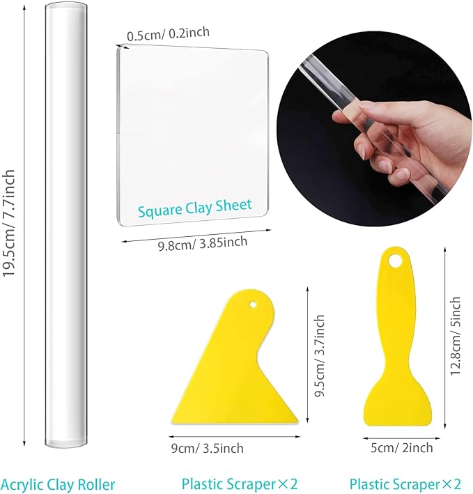 - 35 PCS Polymer Clay Cutting Set: 5 x clay slicer blade, 8 x round clay cutters of different sizes, 14 x plastic crafts clay modeling tool, 4 x scraper, 1 x acrylic clay roller, 1 x acrylic sheet, 2 x clay needle tools.