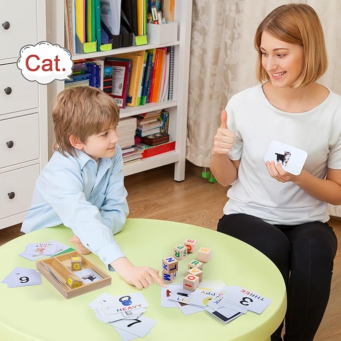 - 【Fun Early Educational Toys】The wooden tray has two slots, the first slot displays the image and word for beginners, and the second slot covers the word while displaying the image for more advanced spellers; The letters in the word are color-coded, to match the required block; the CVC flash cards are two-sided, image + word on one side and just an image on the other, you can also use the card as sight word flash cards