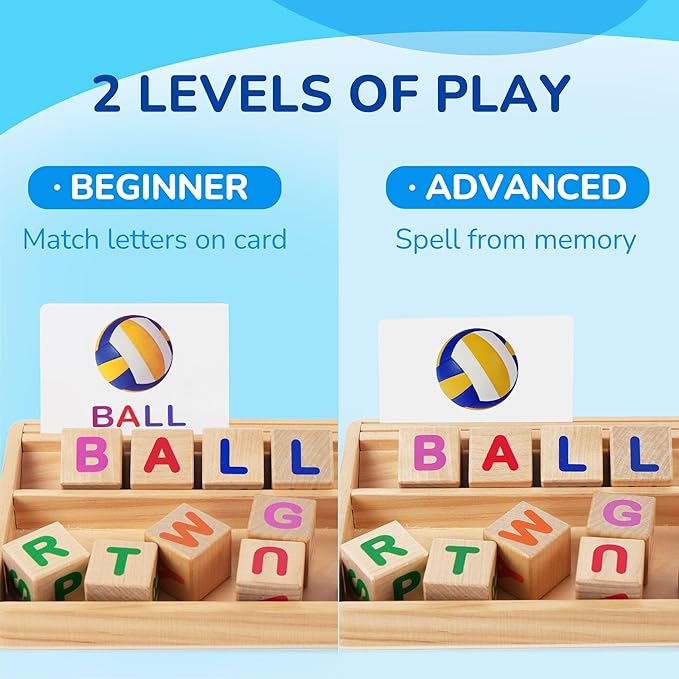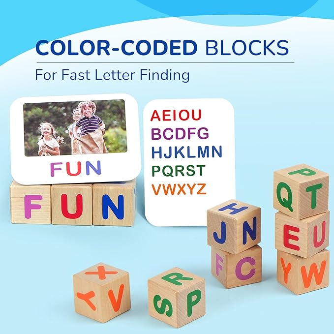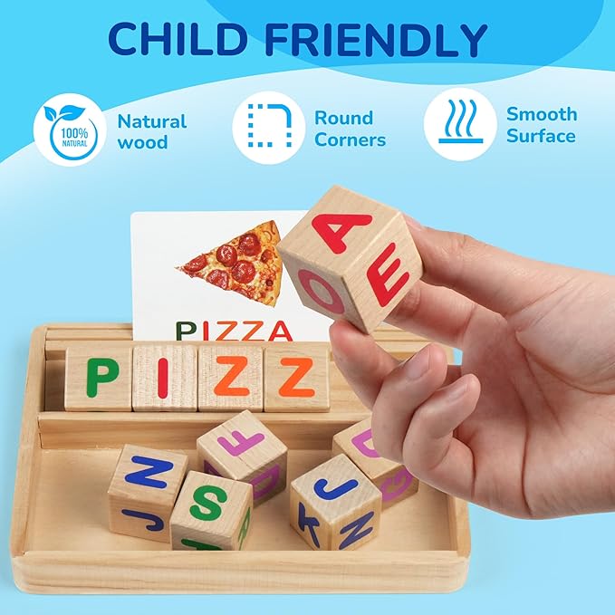 - 【Safe and Durable】The tray and alphabet blocks are made of 100% natural wood, odor-free; smooth edges, non-toxic water-based paint. Large blocks aren't a choking hazard; Double-sided spelling cards are durable cardstock with rounded corners