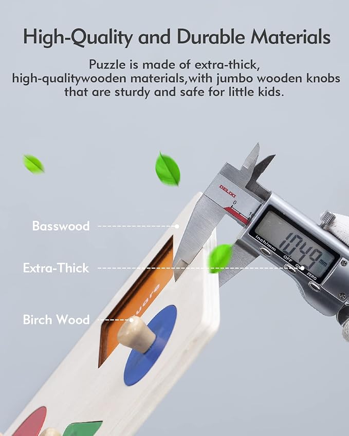 - 【LEARN BASIC COLORS & SHAPES】 Extra-thick puzzle board in 12 geometrical shapes and 6 basic colors, with jumbo wooden knobs that are sturdy and safe for young hands to grasp. The puzzles helps kids to learn correct color which is from International Pantone Standards.