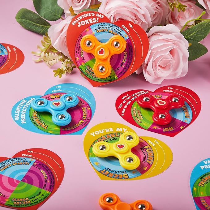 - SUPER VALUE PACK. Our Valentine's Day Gift Cards with Fidget Spinner includes 28 fidget spinner stress relief toys, 28 heart stickers and 28 valentine’s cards with cute messages that match the theme of each toy.