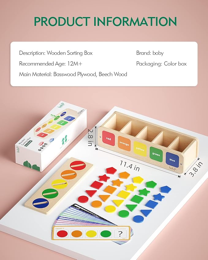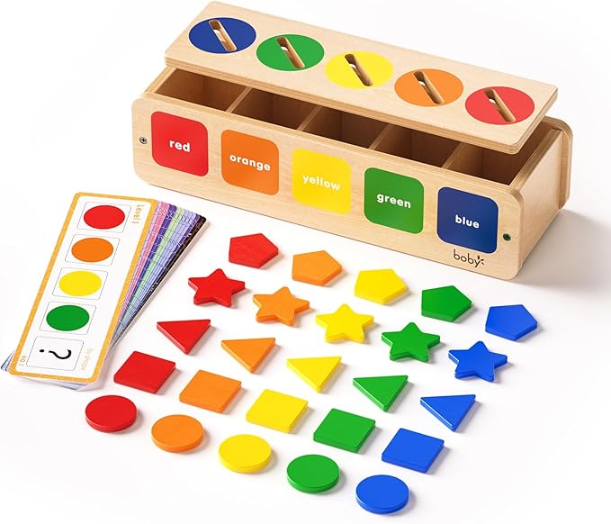 - Boby Shape Sorter includes 25-piece wooden blocks in 5 shapes, 5 colors, 13 double-sided assignment cards, contained in a separate compartment in a sturdy wooden storage. Inspiring kids practice matching and sorting from [Primary] to [Advanced] step by step. Also great for color and shape recognition, and beginning math skills.
