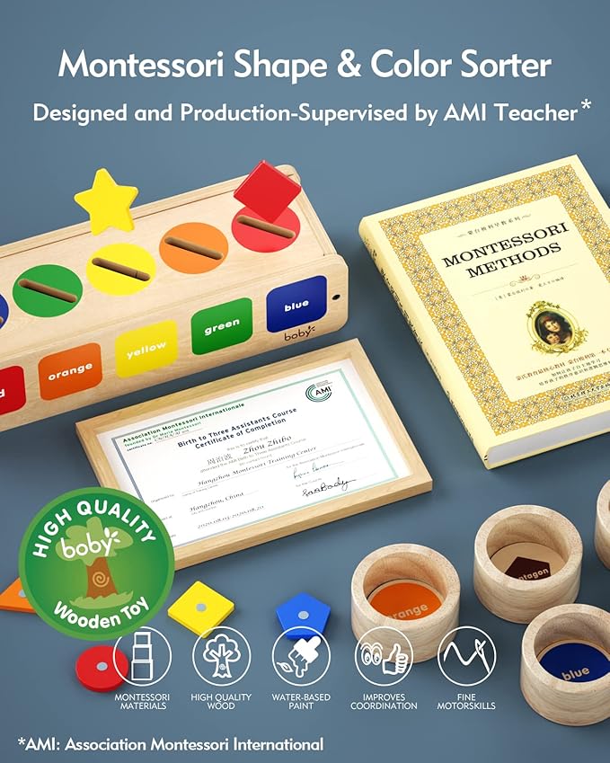 - The Sorting Box designed and production-supervised by AMI Teacher (Association Montessori International), which helps kids develop multiple skills such as fine motor skills, hand-eye coordination, matching, sorting, counting, problem solving, imagination, protect their concentration and inspiring confidence through play.