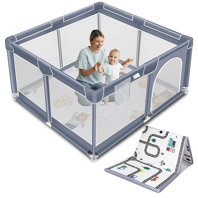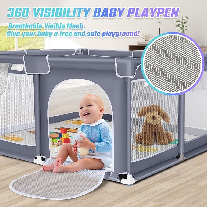 Suposeu Baby Playpen with Mat, Portable Baby Play Yard for Toddler, Safety Baby Gate playpen with Soft Breathable Mesh, Indoor and Outdoor, Large Kids Activity Centery (Grey)