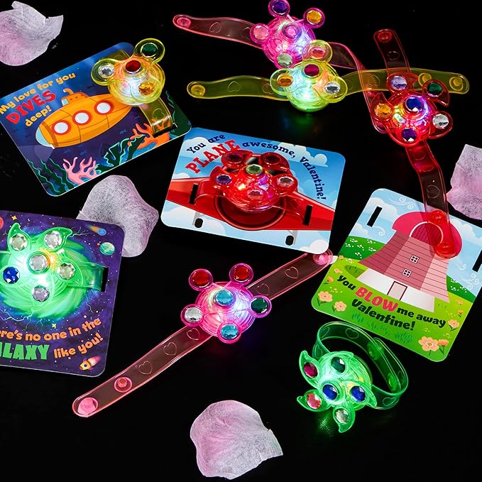 - SUPER VALUE PACK. Our Valentine's Day Cards with Light Up LED Bracelet set includes 12 pcs Valentine's Day Cards in 4 designs and 12 Glow in The Dark Spinner Bracelets. This is the perfect combination of bracelets, led lights and gyro toys that will surprise children and they will love it very much!