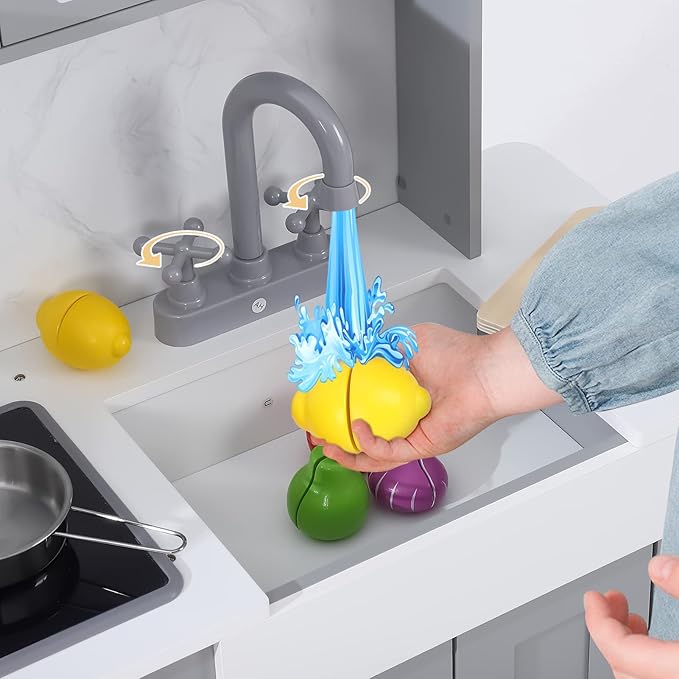- 👩🍳The Kids kids kitchen playset includes a wood kitchen and a set of pretend kitchen toy, such as chef hat, apron, oven mitt, pot, seasoning jar, plate, spatula, ice cube models, wooden cutting fruit and vegetables set. All these help your kids pretend to be a chef and enjoy cooking play time.