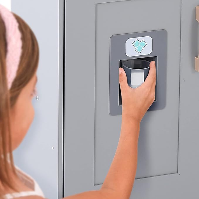 - 👩🍳The kitchen set is a ideal choose to help kid learn the basic skill about kitchen and cooking. Kids can pretend to use Oven, Microwave, Storage Rack, Faucet & Sink. And the stove can play with real light and sound, Ice cubes drop down when button of ice maker is pressed. Chalkboard will help recor & show recipe.