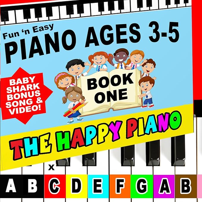 The HAPPY PIANO PRESCHOOLERS Book & Color-Coded Stickers KIT. SO EASY-to-FOLLOW. Kids Toddlers AGES 3-5. Beginner music book, BABY SHARK lesson video, FREE digital bonus, 20K taught since 2006!