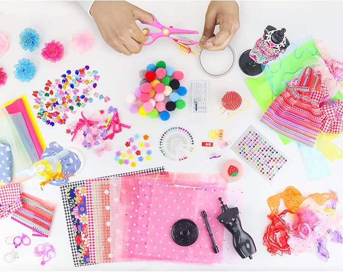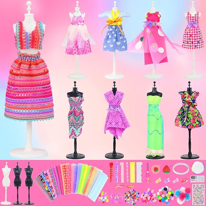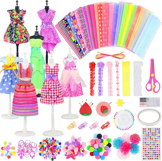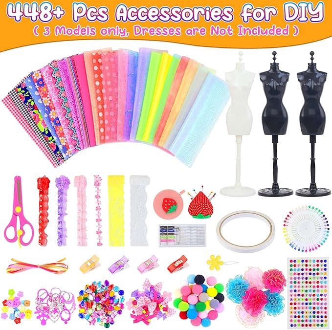 - What you get : 448+ pcs fashion design kit includes 4 dress mannequins, tape measure, fabrics, trims, ribbons, scissors, sewing tools, beautiful bows, rhinestones stickers and other embellishments.