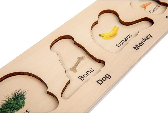 - đăEducational and Fună: The Montessori Animal and Their Food Puzzle offers a delightful and engaging way for children to learn about animals and their food preferences. This rectangular puzzle set consists of beautifully illustrated pieces featuring five beloved animals â a cow, dog, monkey, rabbit, and honeybee â arranged on the top layer.