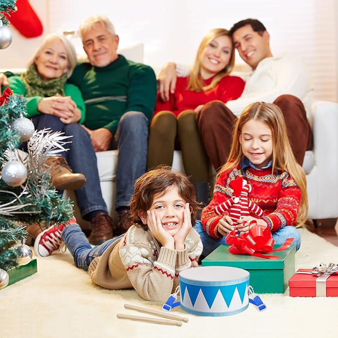 Kids Drum Set 7.87 in Wooden Toy Drum with Adjustable Strap 2 Drumsticks Educational Sensory Musical Instrument Set for Toddlers Kids Baby Toy Gift(Blue Triangle Style)