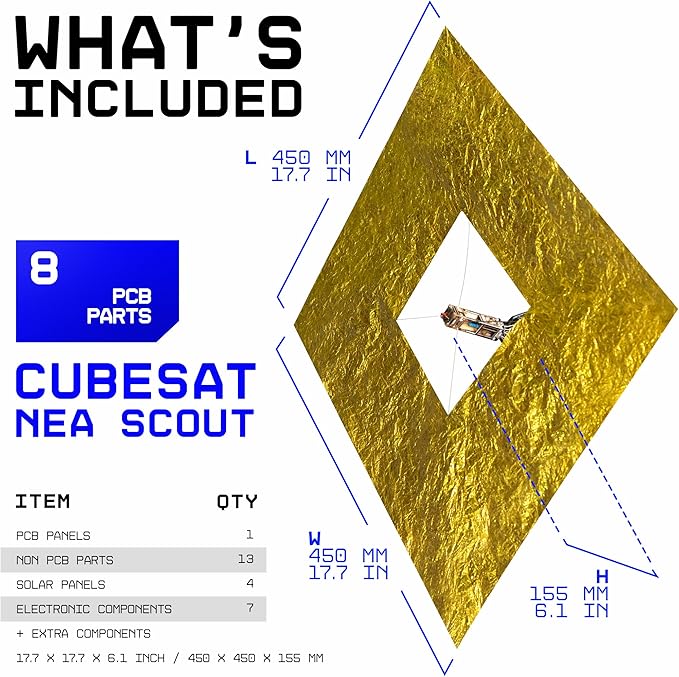 - 🛰️ Start Building Your Own NEA Scout Right Away: Everything you need to craft the Cube SAT model is found in this box -a gold-plated PCB, solar panels, ceiling wire for suspended display, and soldering tools for easy and safe assembly.