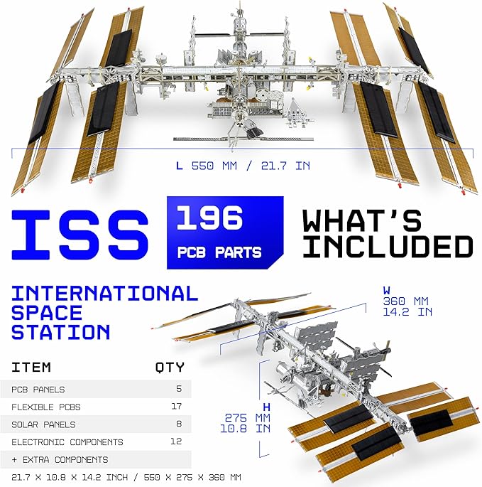 - 🛰️ Real Solar Powered ISS Model Kit: This STEM science kit features 8 solar panels that will power your International Space Station - just like the real ISS. Plus, there are 5 PCB panels, 12 electronic components, and 17 flexible PCBs.