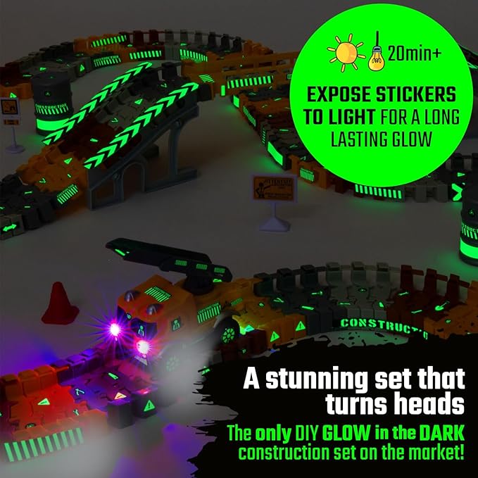 - 【Build, Play & Glow In the Dark】Customize your kids race track set and construction trucks toys! Create and customize awesome construction vehicles for kids ages 4-8 with this building playsets themed glow in the dark stickers that light up the playset, playtime and lasts for hours. Their creativity will grow while playing, learning how to connect, decorate and develop unique buildable ideas!