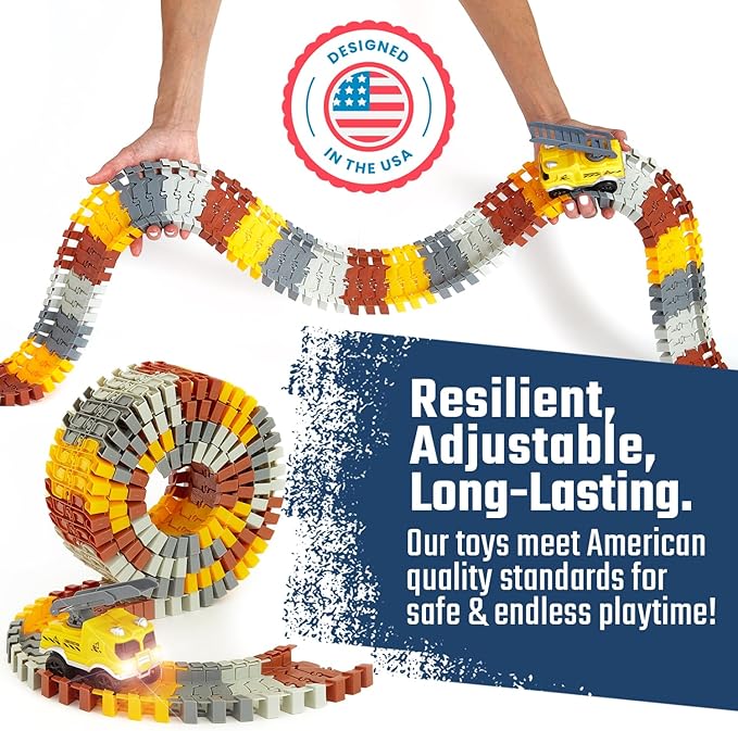 - 【Flexi-Tracks for Creative Minds】This car builder sets pack comes with easy to adjust, strong, bendable, flex and durable track. Your children will create a unique spin on the traditional construction sites with gravity bending and epic turns! Set up on the table or zoom around furniture, you can even use other series brand cars - any model toy car from any year can hop in on the top fun!