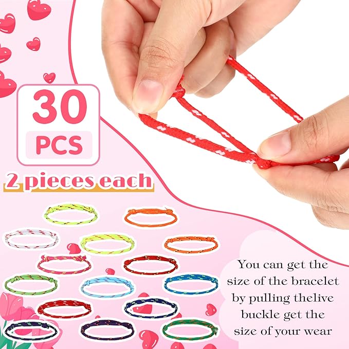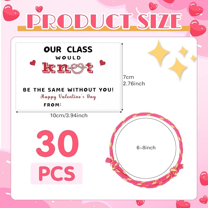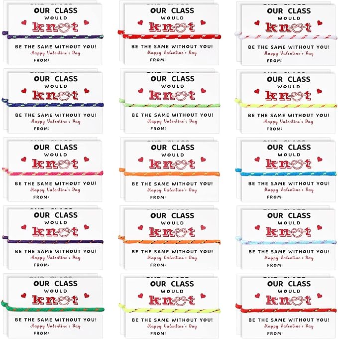 - Valentine's Day Party Supplies: the package comes with 30 Valentines knot bracelets bulk and 30 Valentine cards for class, and the bracelet has 15 different colors; The quantities are enough for you to send students or teachers on Valentine's Day