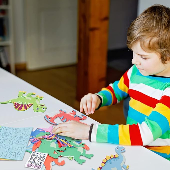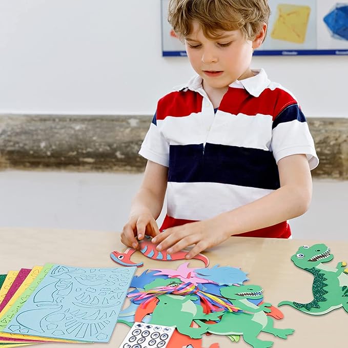 - Dinosaur Craft for Kids:The EVA foam art crafts for kids includes 12 pack of Dinosaur craft sets.There are 6 different designs ,including dinosaur body, dinosaur eyes and other foam sticker accessories.A lot of foam stickers enough quantity to meet needs on a activity for kids,kids can make their own dinosaur arts crafts set!