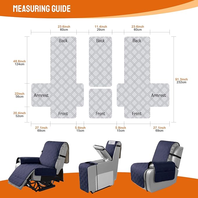 - DIMENSION GUIDE: VANSOFY 2 seater covers fit a loveseat recliner up to width of 47.2in/ 120cm (WITHOUT CONSOLE). Or 2 separated sitting width of 23.6in/ 60cm(WITH CONSOLE width of 11.4in). Armrest width of 22in/ 56cm, back length of 48.8in/ 124cm, see measurement guide in images. Tucking extra part into chair seams to make perfectly fit