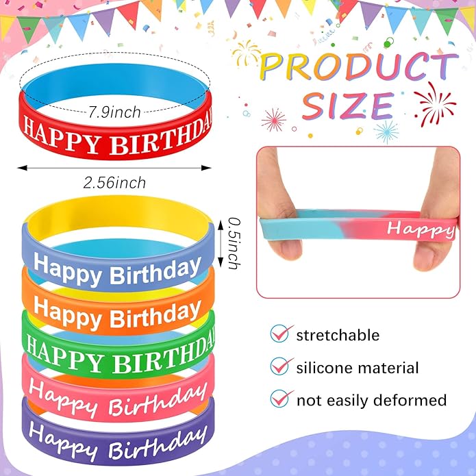 - Buy with Confidence: the happy birthday wrist bands are made of quality silicone material, sturdy and reliable, comfortable to wear, not easy to tear or break, designed in bright and vibrant colors, hard to fade, providing you with a service for a long time