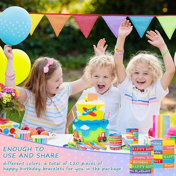 Sratte 120 Pcs Happy Birthday Rubber Bracelets for Kids Stretch Wristbands Bulk Birthday Bracelets for Classroom Student Back to School Gift Teacher Birthday Party Favors Supplies