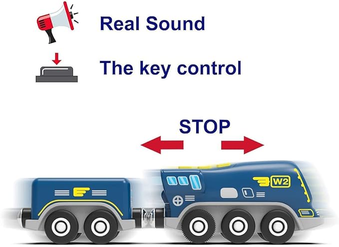 - Product Includes: Train Toy Contains a Train Engine And a Travel Train, Coming With Front And Rear Lights, And Buttons For Forward, Stop And Reverse. Features a Realistic Sound Effect When Moving And Stop.