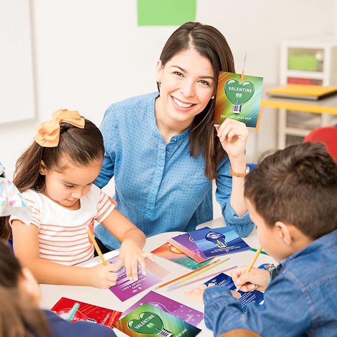 - Funny Light Bulb-themed Valentines Gift Cards-The light bulb-themed cards is 4.7x3.9 inch, the glow sticks is 7.9 inch long. Cards double-sided printing, clear and bright patterns, Each card is matched with a glow stick, glow stick long lasting, 10-14 Hours of glow time, excellent quality.